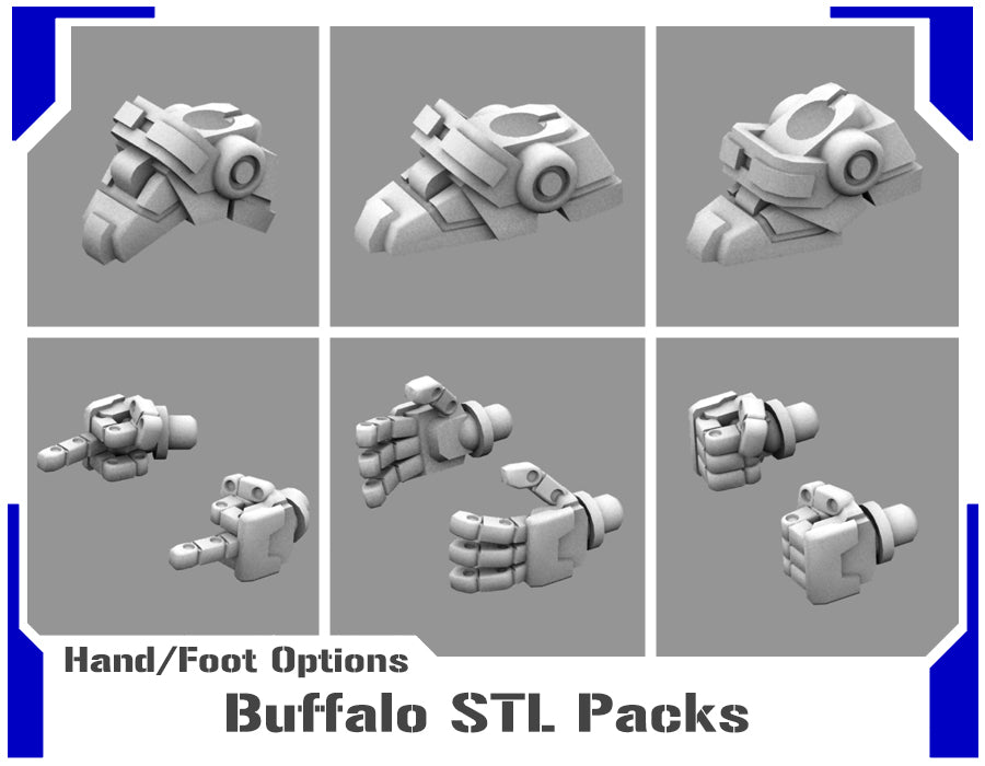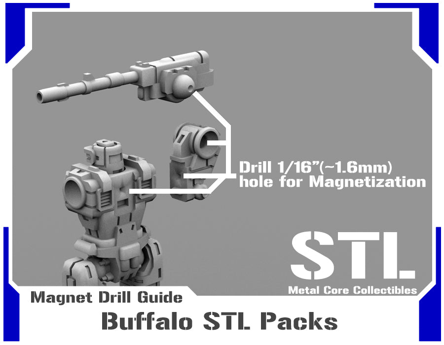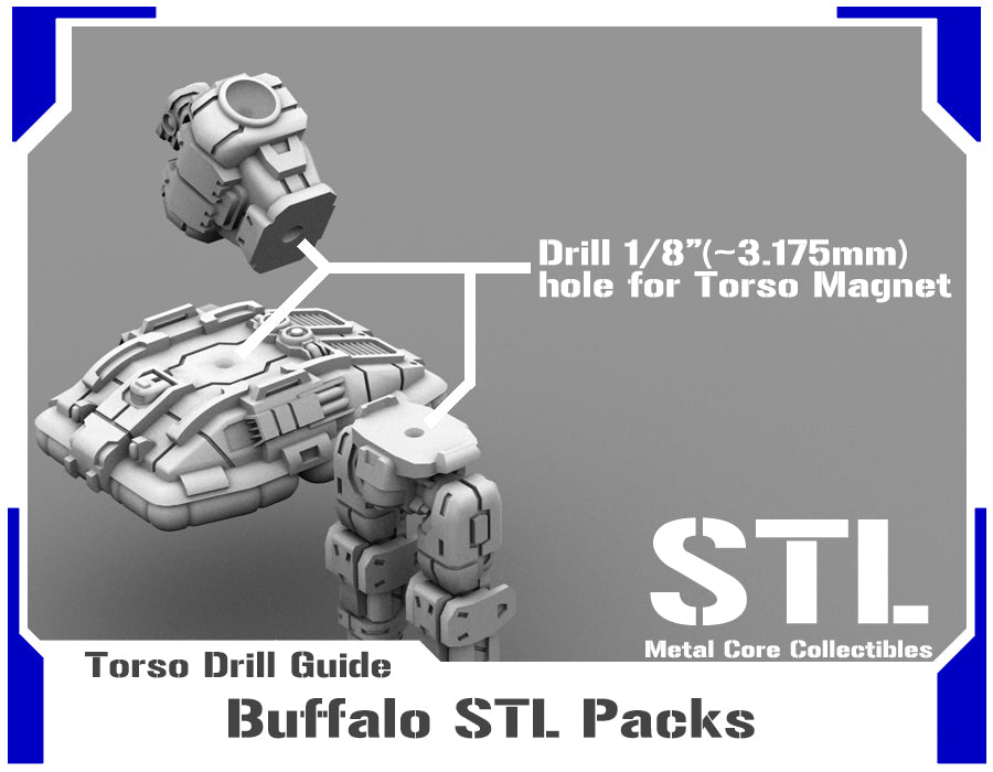 Notes The Buffalo will require a 1/8"(~3.175mm) hole to be drilled into the Torso and Pelvis to allow for 1/8"(diameter) x 1/16"(height) cylindrical magnets to be installed so that the Torso may freely rotate. A different sized hole can be used if you plan on using different sized magnets. In addition 1/16" x 1/16" cylindrical magnets can be installed in multiple locations to allow for swapping weapon and other option parts freely as desired.